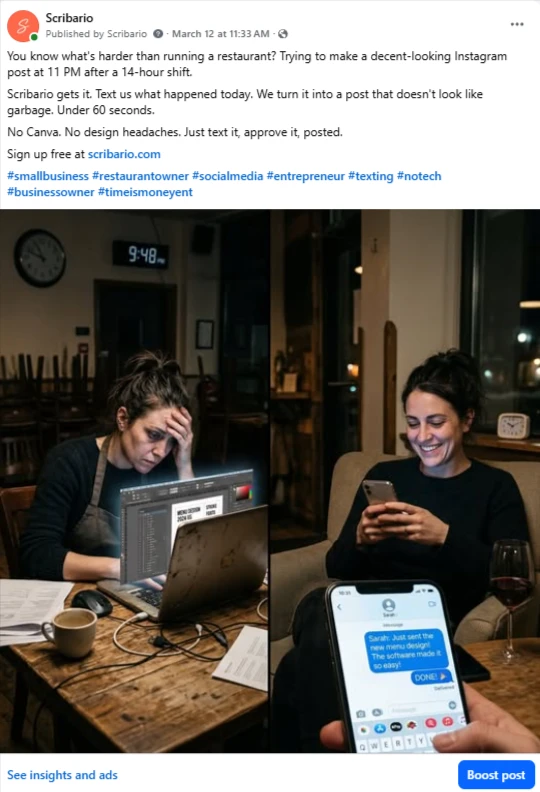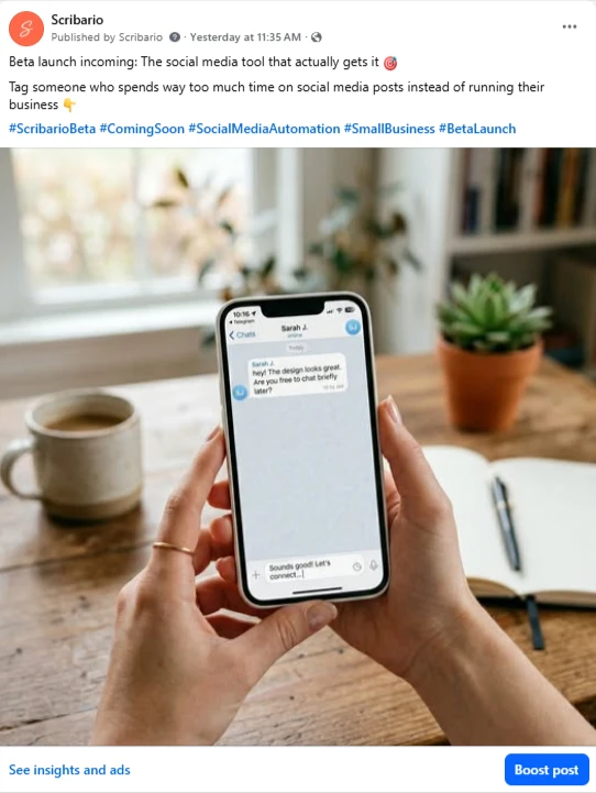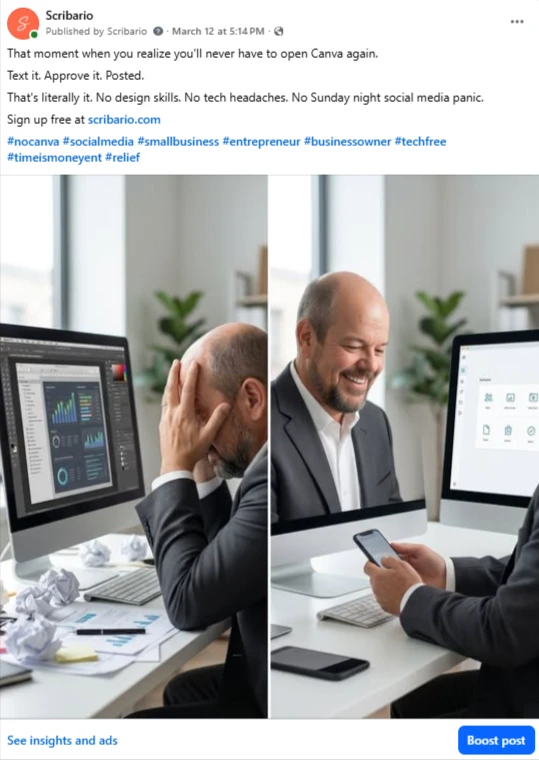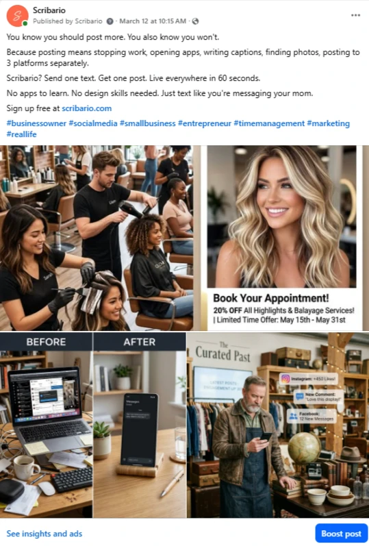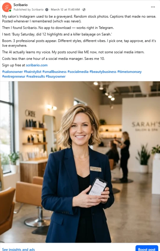 Real posts. Real Facebook page. Every image and caption below was created and published by Scribario — no designer, no copywriter, no Canva.